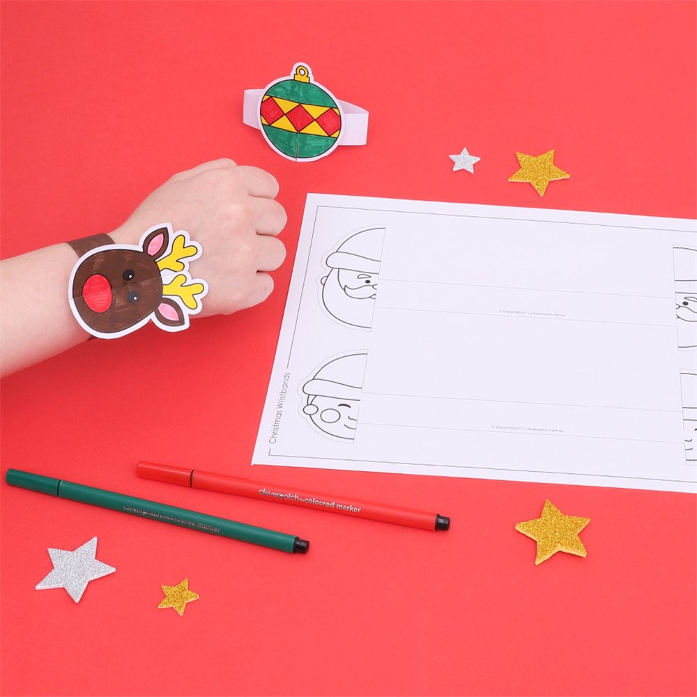 • Step 1Download and print out the Christmas Wristband templates provided onto white cover paper. Cover paper provides a sturdier base for your wristband, while still being flexible enough to wear comfortably. Decorate the templates using coloured markers or pencils.