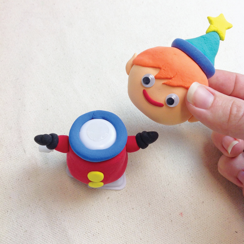 • Step 3Attach the gloves to red air dry clay to create arms, then attach them to either side of the body. Add two yellow buttons to the front of your Elf, making sure the mechanism is facing the correct way so he doesn’t walk backwards!