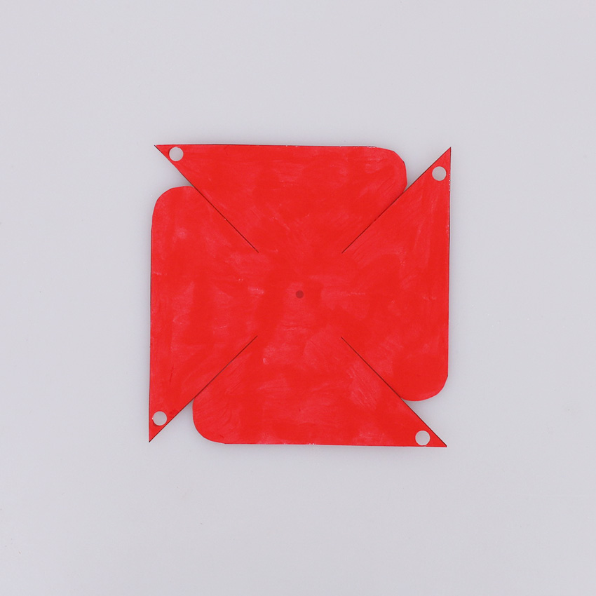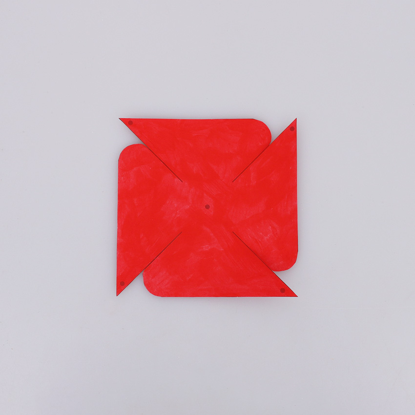 • Step 4Take one of your template pieces. Bend each point of the paper to the centre and align all the holes with the middle grey dot. Push the paper fastener through the holes and the grey dot on the poppy.