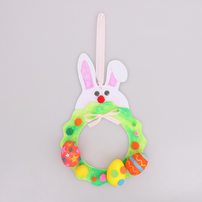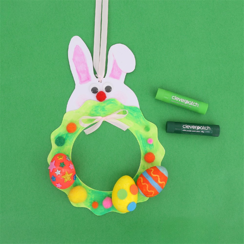 • Step 5Glue the bunny template to the back of the wreath, positioning the bunny’s face peeking over the wreath. Decorate the rest of the wreath however you would like using pom poms. Allow to dry. Use a hole punch to create a hole at the top of the bunny’s head and tie a length of ribbon to create a hanger.