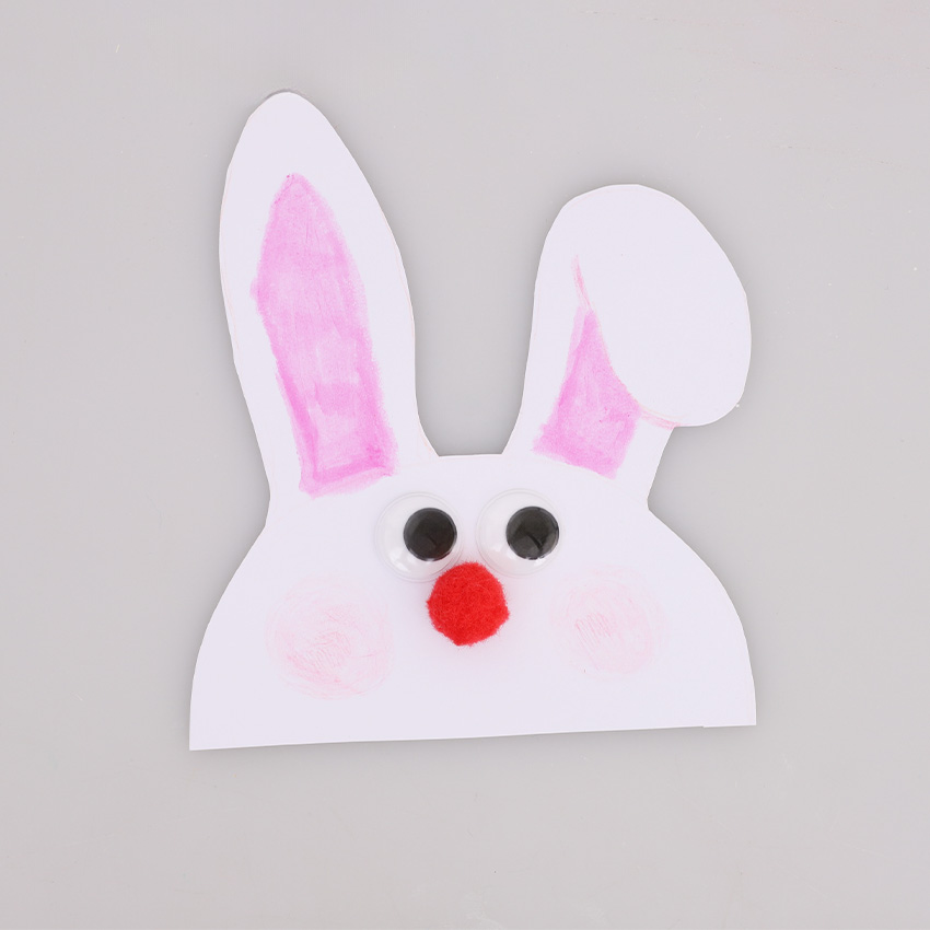 • Step 2Download and print out the template provided. We recommend printing onto cardboard as this provides a sturdy surface. Decorate the bunny template using paint or paint sticks and allow to dry. Once dry, carefully cut out your template. Adult supervision is recommended when using scissors. Attach two wiggle eyes and glue a red pom pom to create the nose on the front of the template. Hold in place until dry.