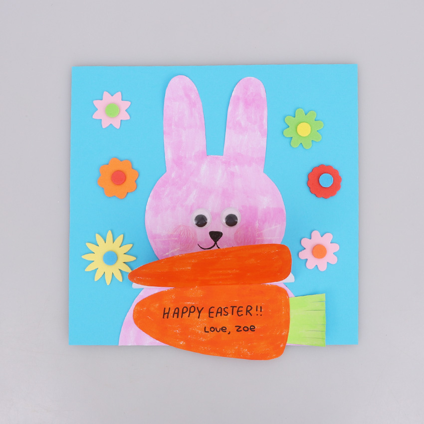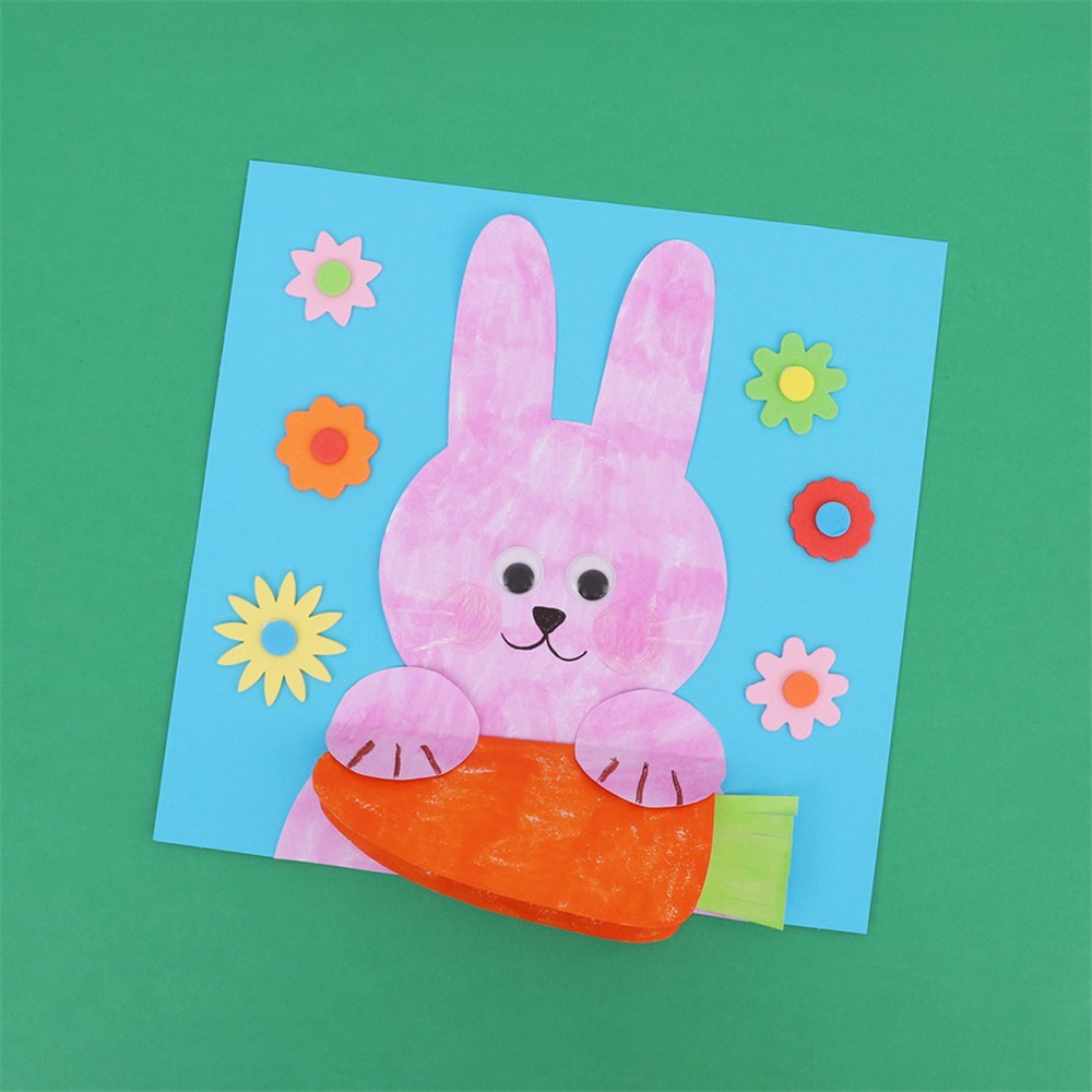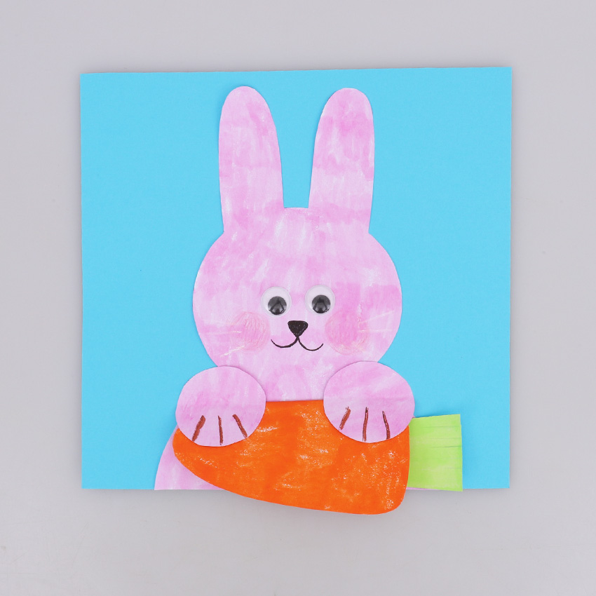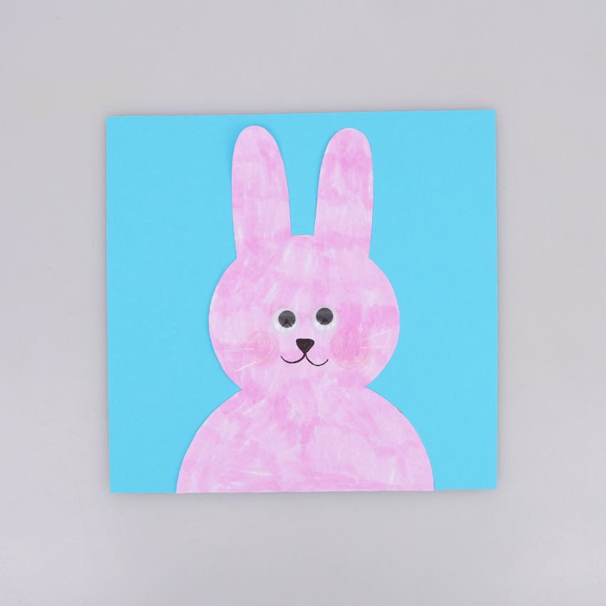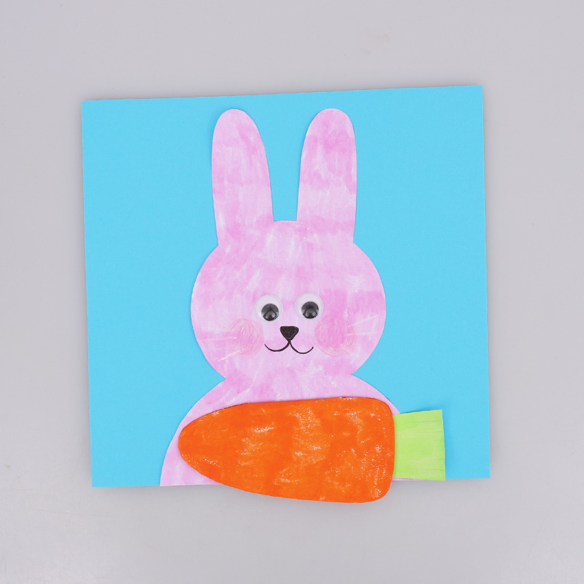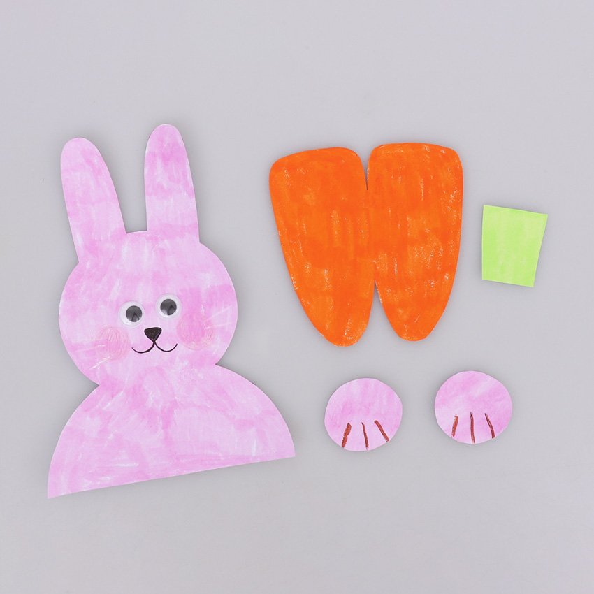 • Step 1Print out the template provided onto cover paper, as this will provide a sturdy surface for creating your card. Decorate the template however you would like using your favourite craft materials. We’ve added self-adhesive wiggle eyes for our bunny. Allow to dry if needed, then cut out the templates. Adult supervision is recommended when using scissors.
