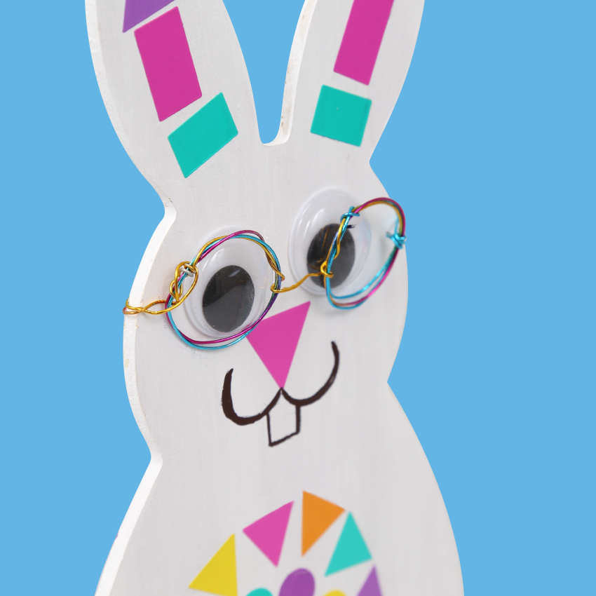 • Step 6Take the glasses frame you created in the last step and use a second piece of florist wire to loop around the back of the bunnies head, fastening it on either side of the glasses. Your Bright Wooden Bunny is now ready for Easter!