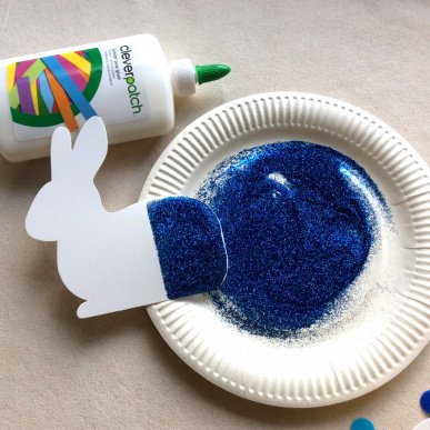 • Step 2Next decorate your bunny with glitter. To get a straight line, cover the front half of the Bunny body with a piece of paper then apply a light coat of glue.