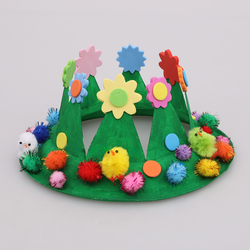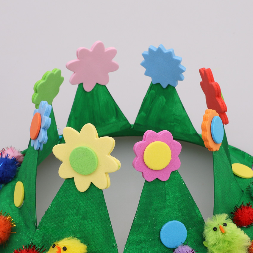 • Step 3Attach a foam flower sticker to each of the points on the crown. Take another foam flower sticker that is the same colour and size. Align the second sticker with the flower already on the crown and attach to the other side of the point. Continue in this way until each point is covered on both sides. Decorate the rest of the crown using pom poms, foam stickers and chicks. Allow to dry.