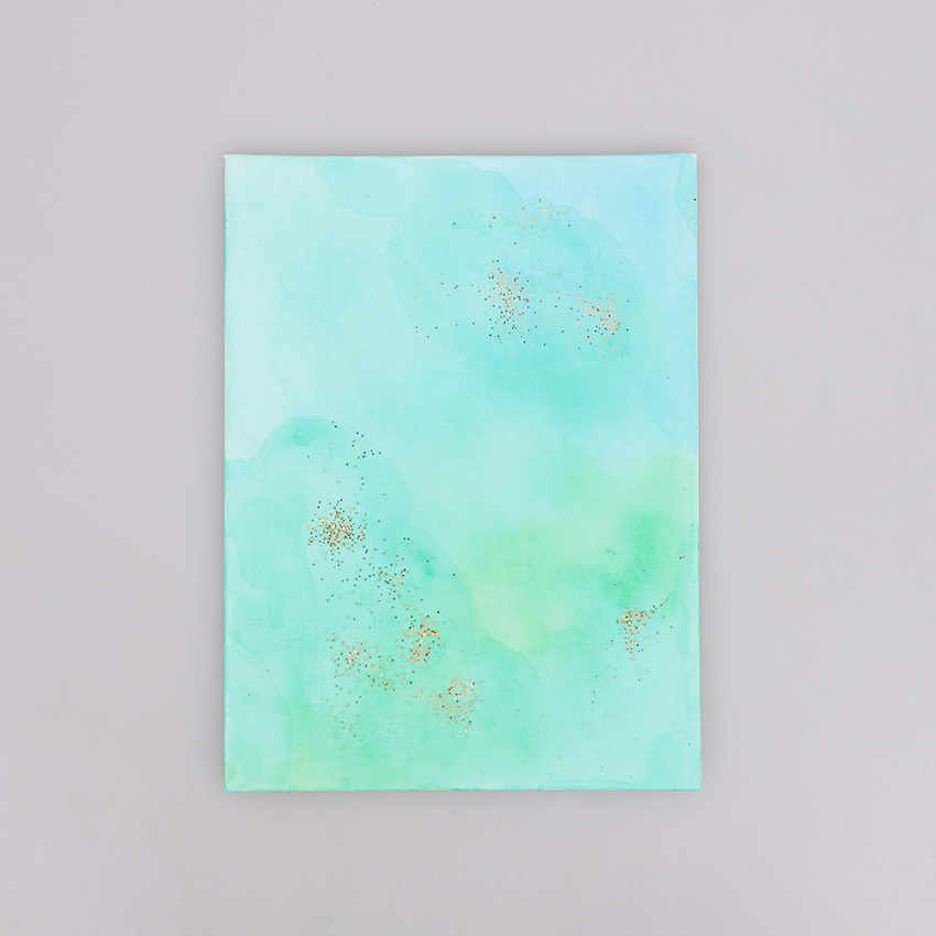 • Step 1Paint your canvas using watercolour then quickly add some glitter onto the canvas to add some sparkle before the paint has dried. Allow to dry.