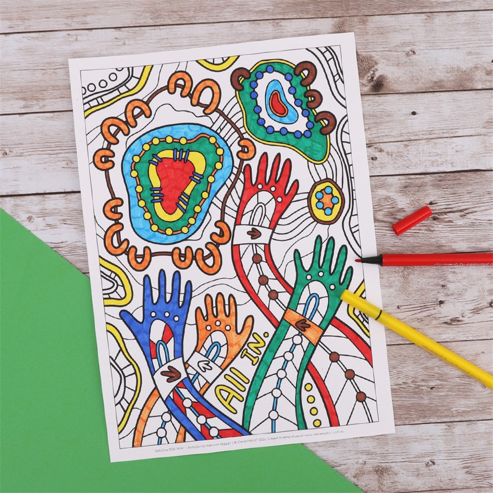 “National Sorry Day is a time when we remember the Stolen Generations. We look back with respect, so we can live in the now and help create a better future. This artwork honours their strength, stories, and culture, and reminds us to go “All In” and to listen, to learn, and to walk together with kindness and care.”