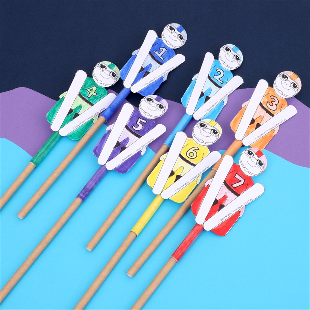 • Step 2Decorate your skier using coloured pencils or markers and give them a racing number. Carefully cut out your skier and rectangle template pieces. Adult supervision is recommended when using scissors.