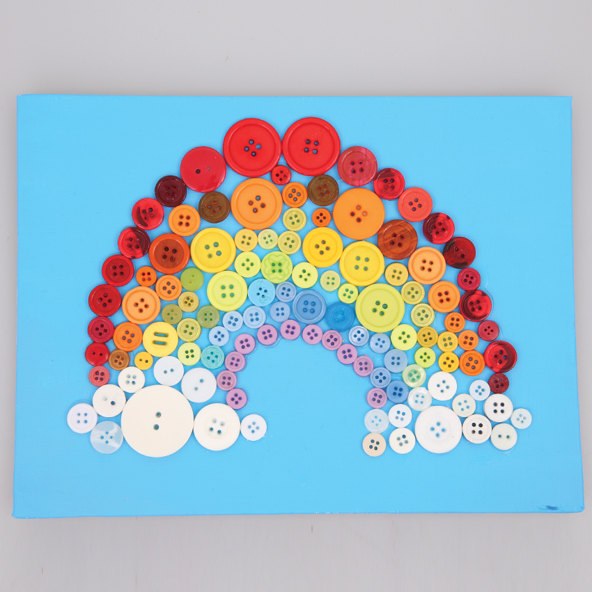 • Step 6Once you have created your rainbow, carefully apply glue to the back of each button and glue to your painted canvas. Your design may change slightly with the movement of the buttons as you go, but that’s okay! It’s all part of the creative process! Allow to dry completely.