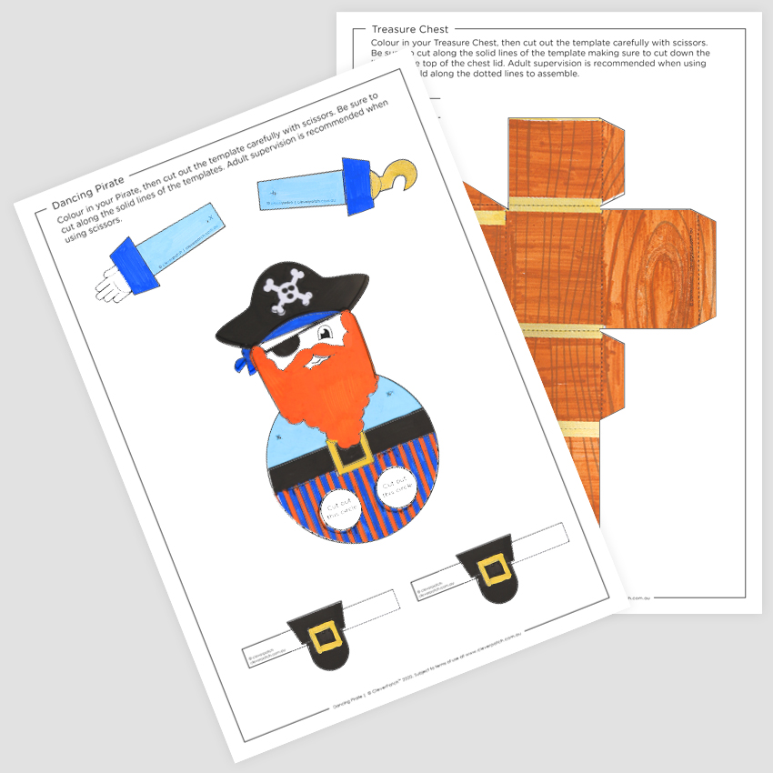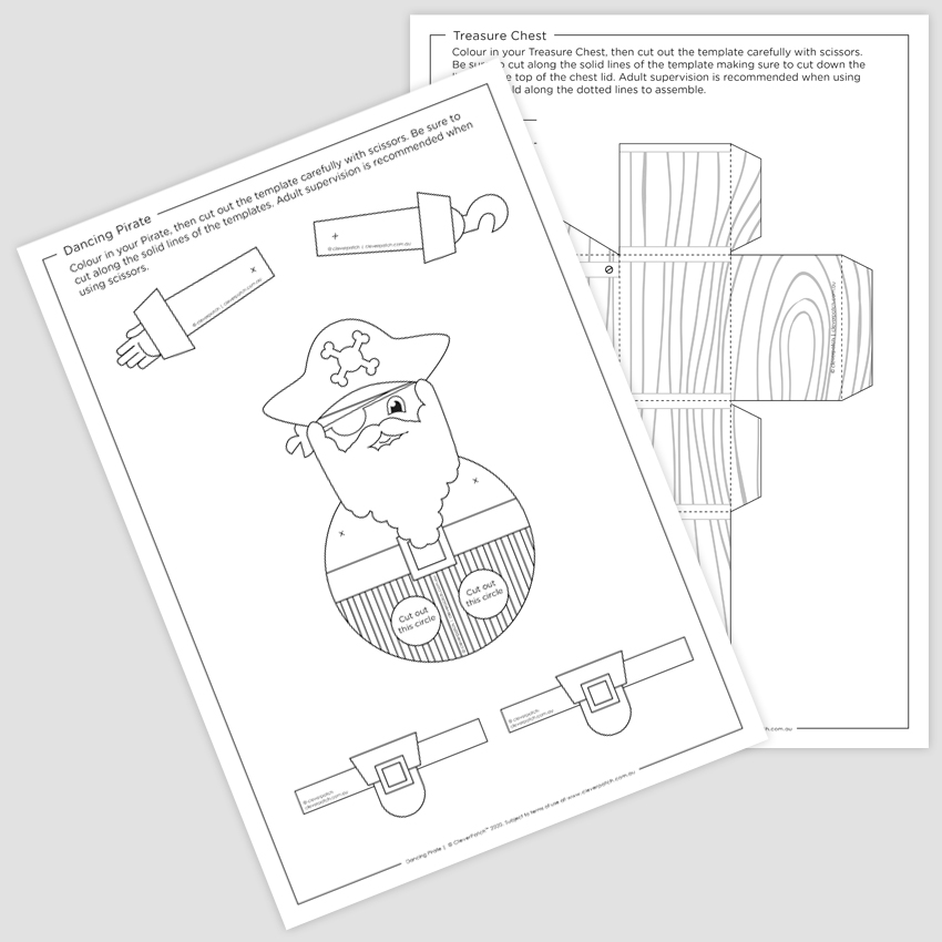 Ahoy there! Create your own Dancing Pirate and Treasure Chest! Simply print and decorate the templates, then assemble each one.