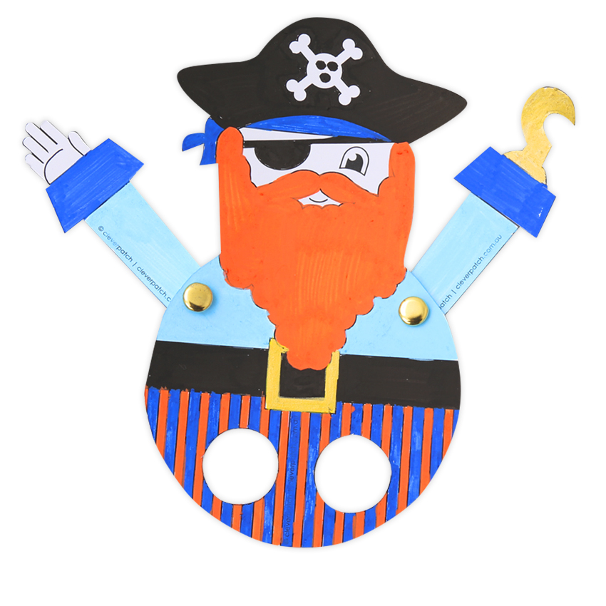 • Step 4Use Paper Fasteners to attach the Pirate’s arms onto his body. Position the arms using the ‘x’ marks as a guide.