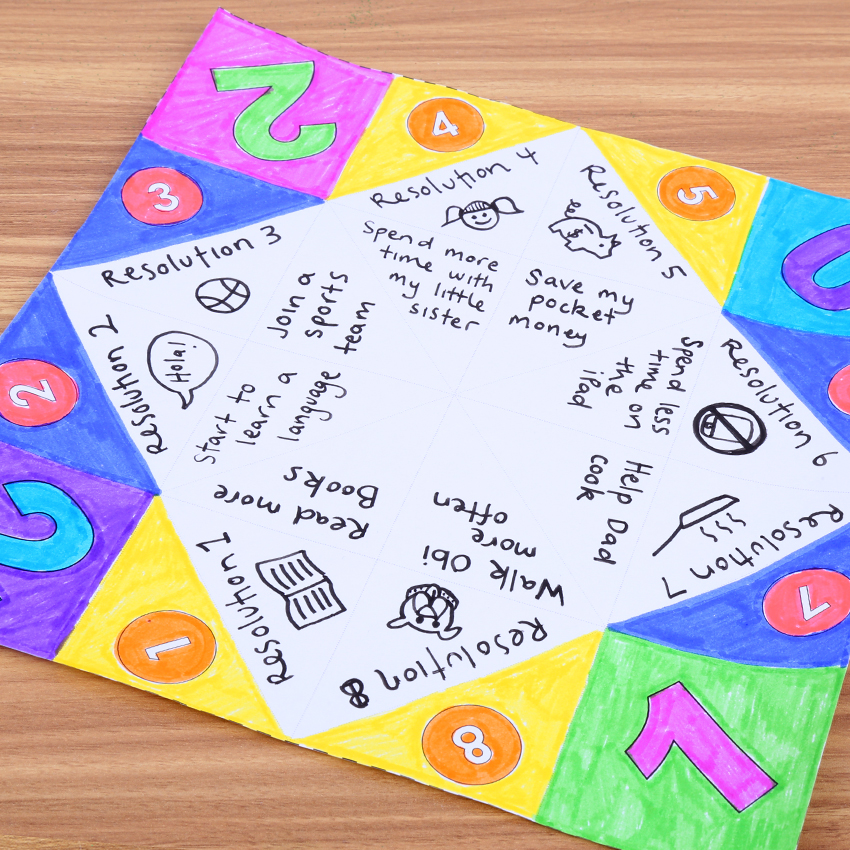 • Step 2Decorate the chatterbox template making sure to write your New Year Resolutions in the spaces provided. Cut out the chatterbox. Adult supervision is recommended when using scissors.