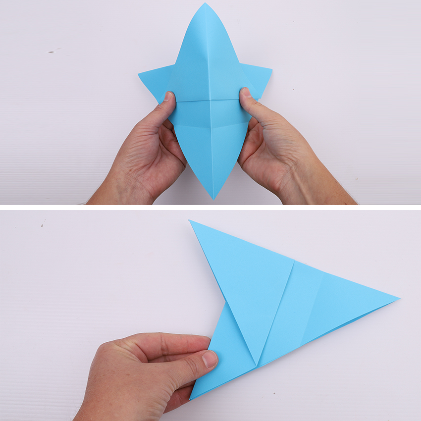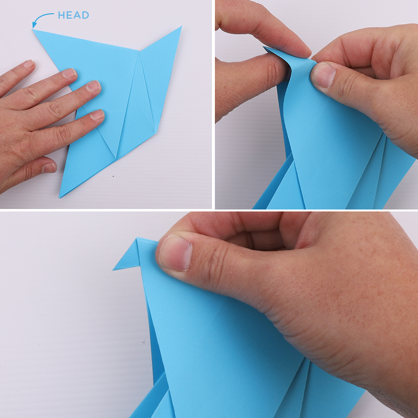 • Step 8Fold the top flap down to open the shape then fold the side points inwards. Fold the top flap back up into place as shown – this is the bird’s head and beak.