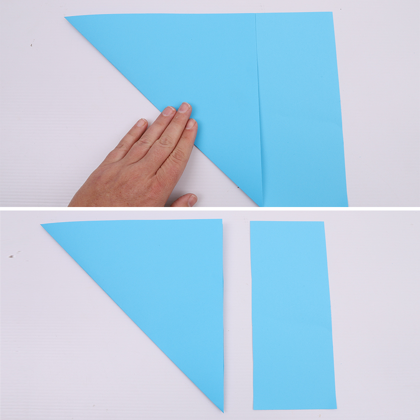• Step 1Start by creating a square from an A4 sheet of cover paper. To do this, fold one of the corners on a diagonal so the corner is in line with the opposite side then trim the excess paper as shown. Adult supervision is recommended when using scissors. Unfold your square.