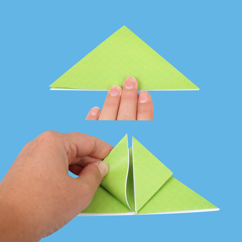 • Step 4You should now have a triangle. Take the left and right points of the triangle and fold up to the top point, creating 2 smaller triangles. Only take the top flap at each point when you fold, then crease firmly.