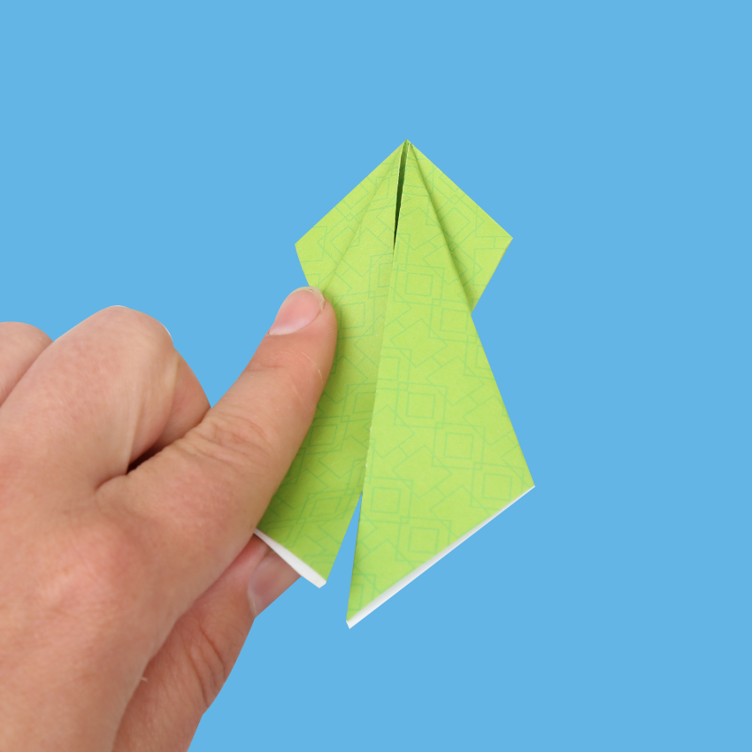 • Step 9Bring the top of the paper down, folding it in half. The top part is the frog’s body while underneath are the legs. Flip the paper over. Fold the legs in half so they are now pointing back downwards.