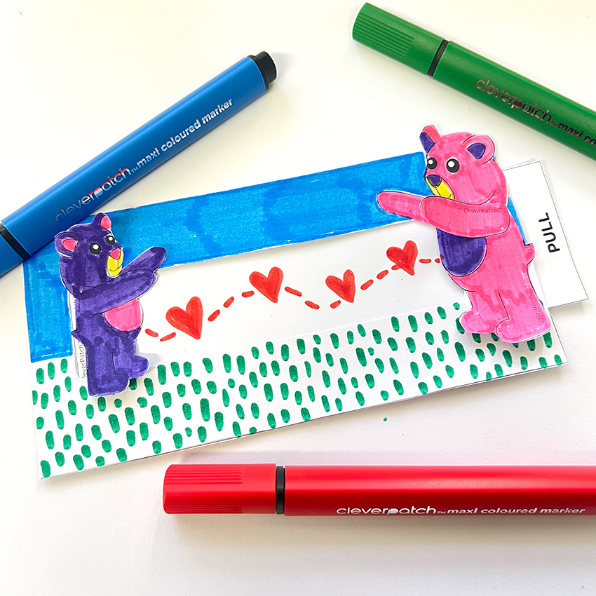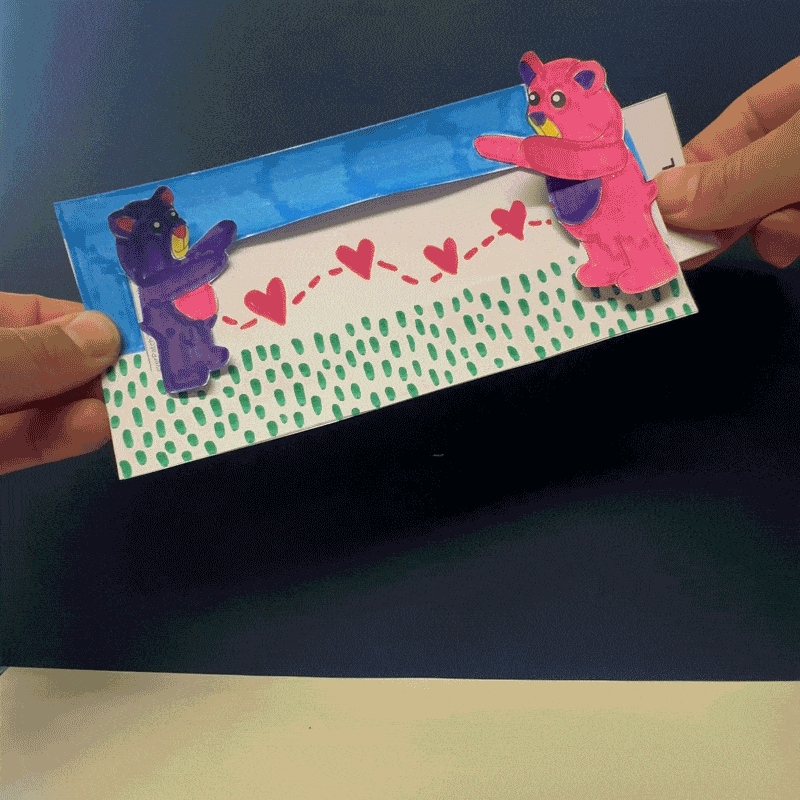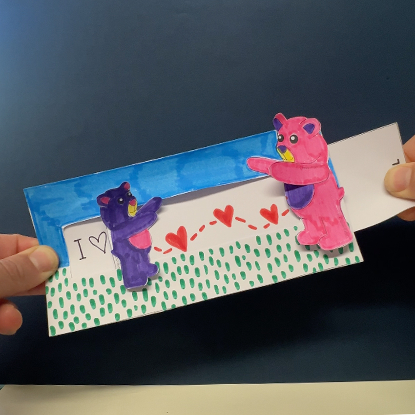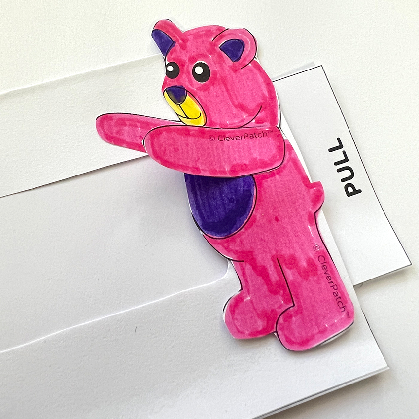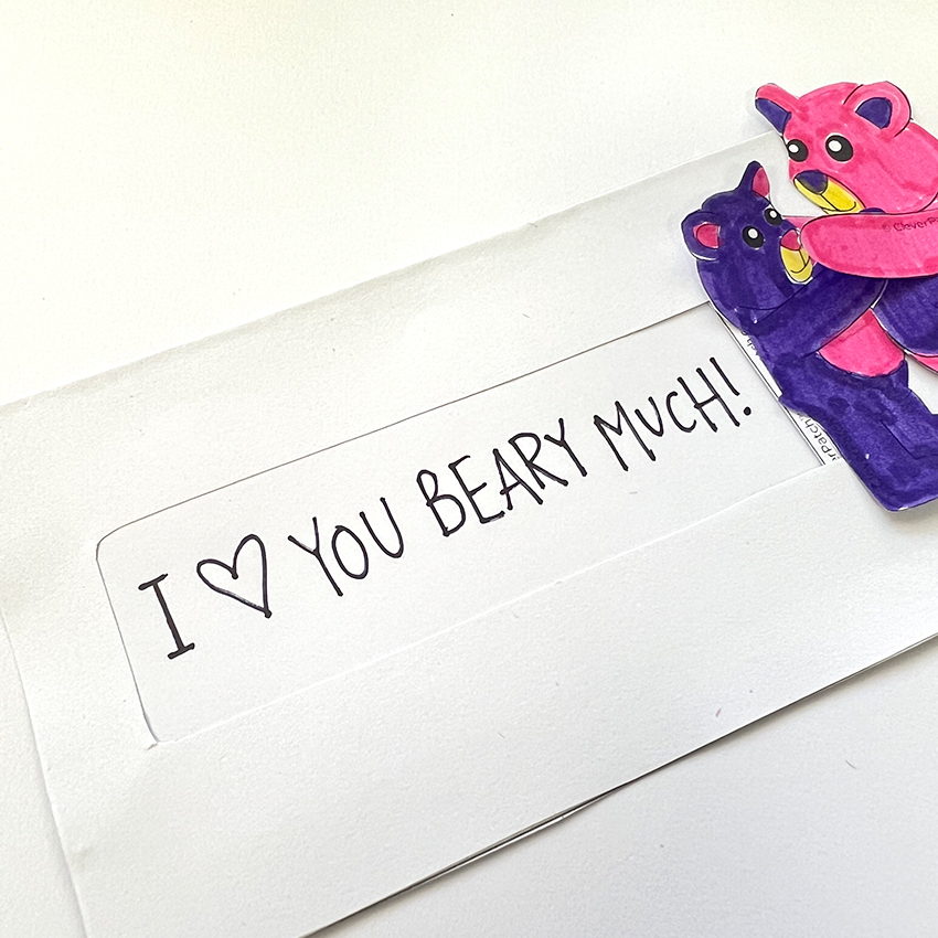 • Step 7Pull the ‘PULL’ tab out of the pocket so the bears meet together on the right side. Add a special message to the inner window of the large rectangle piece to the left of the bears.