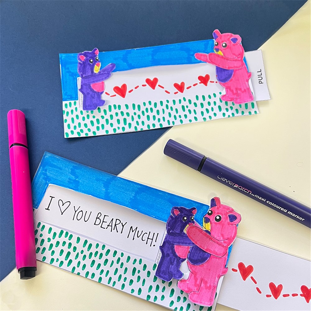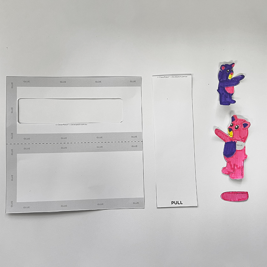 • Step 2Decorate the bear template pieces and the small arm piece below them using coloured markers, pencils or paint. Allow to dry if needed. Carefully cut out the template pieces along the thick outer lines. Make sure you also cut out the inner window of the large rectangle piece. Adult supervision is recommended when using scissors.