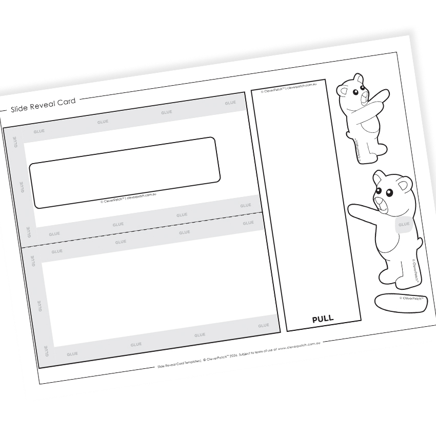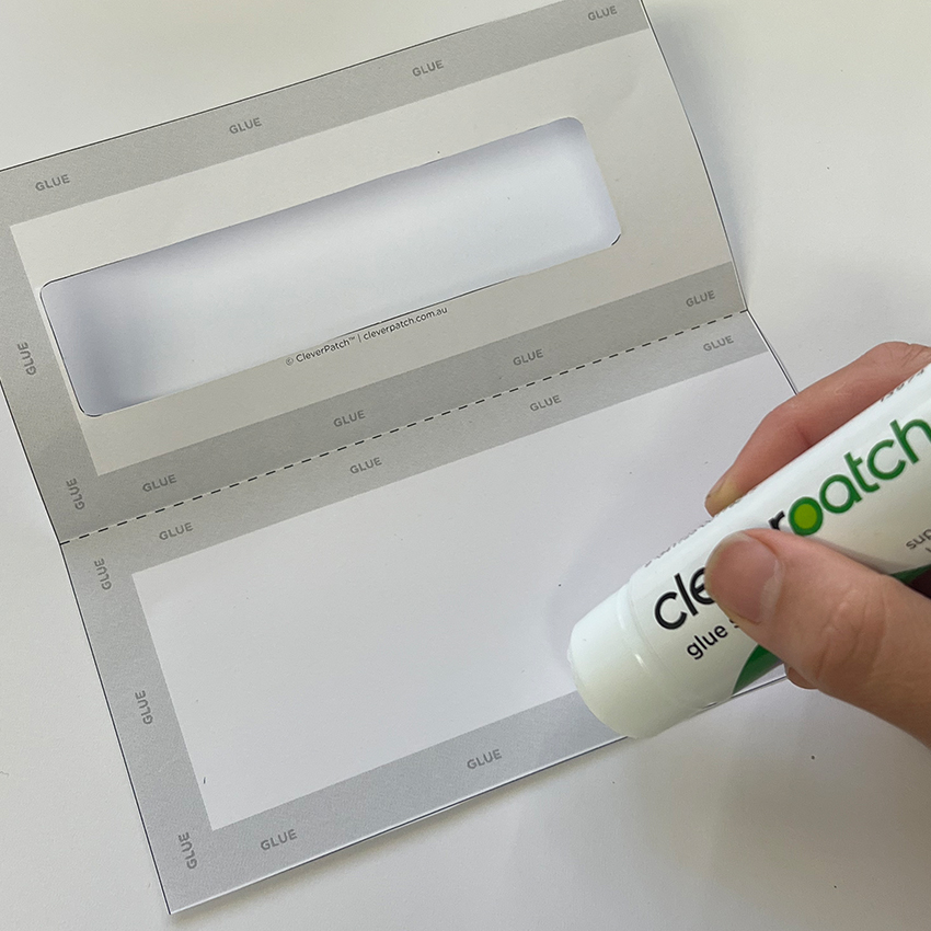 • Step 3Valley fold along the dotted line to create your folded slider card. Open back up and add glue along the grey ‘GLUE’ tabs before refolding to stick the edges together to create a rectangular ‘pocket’. Allow to dry.
