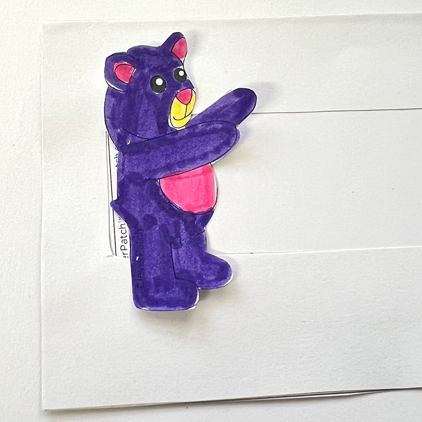 • Step 6Glue the larger bear to the right edge of the pocket, making sure the arm piece is stuck down. Glue the missing arm piece in place indicated by the grey ‘GLUE’ section. Be careful to only add glue to this section so the rest of the arm sticks up. Allow to dry.