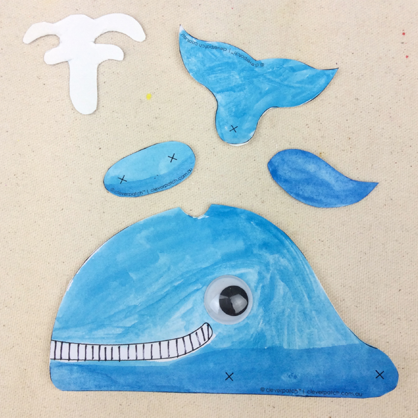 • Step 2Decorate your whale pieces and use scissors to cut them out. We have decorated using watercolours, a wiggle eye and black pen. Adult supervision is recommended when using scissors.