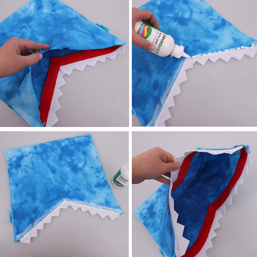 • Step 5Use the templates provided to cut out four teeth from white felt, four gums from red felt and one fin from blue felt. Use tacky glue to stick the teeth onto the gums as shown. Allow to dry.
