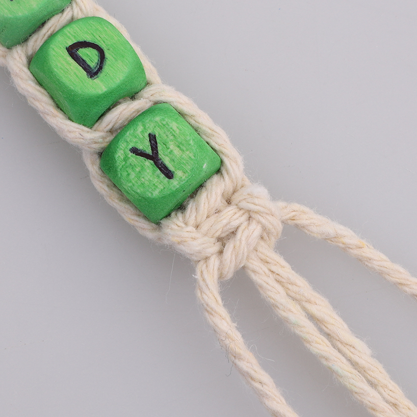 • Step 7Add the second bead of your message. Push it up under the half square knot and tie another half square knot below, this time starting with the opposite side you used in Step 6. Continue threading on beads and tying alternate half square knots until your whole message has been added and there is a half square knot under the final bead.