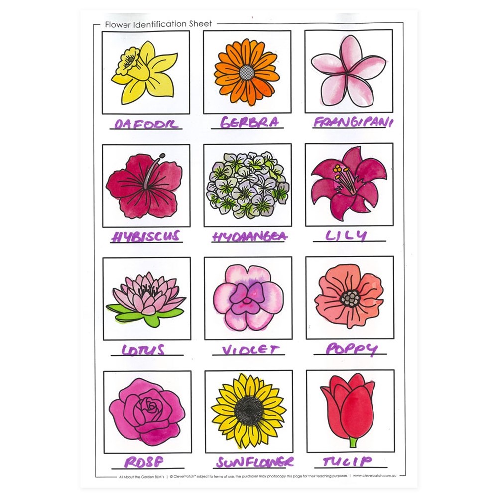 - Step 1This activity sheet teaches children about different types of common garden flowers, how to identify them and what they are called.
