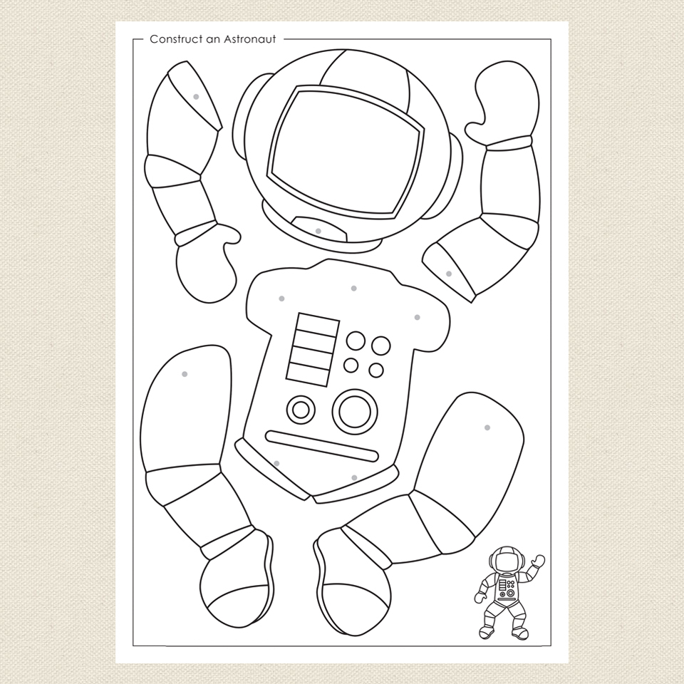 • Step 9Construct an Astronaut - Decorate the Astronaut. Once cut out, use paper fasteners to create a moveable astronaut or alternatively use glue to attach the head, arms and legs.
