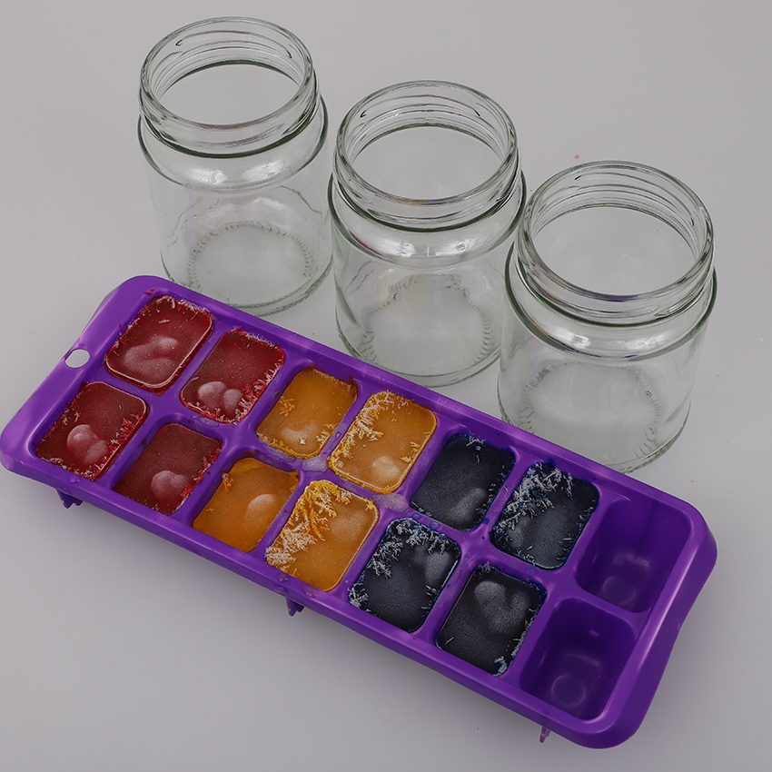 • Step 2Once the coloured ice cubes have frozen solid, take them out of the freezer and gather 3 jars.