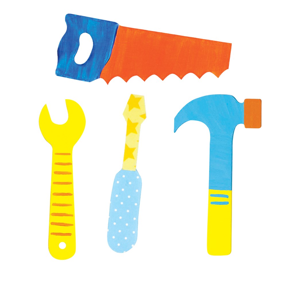 4 assorted shapes. Plain for you to decorate. Hammer measures 6 x 10 x 0.3cm. 3mm wood.
