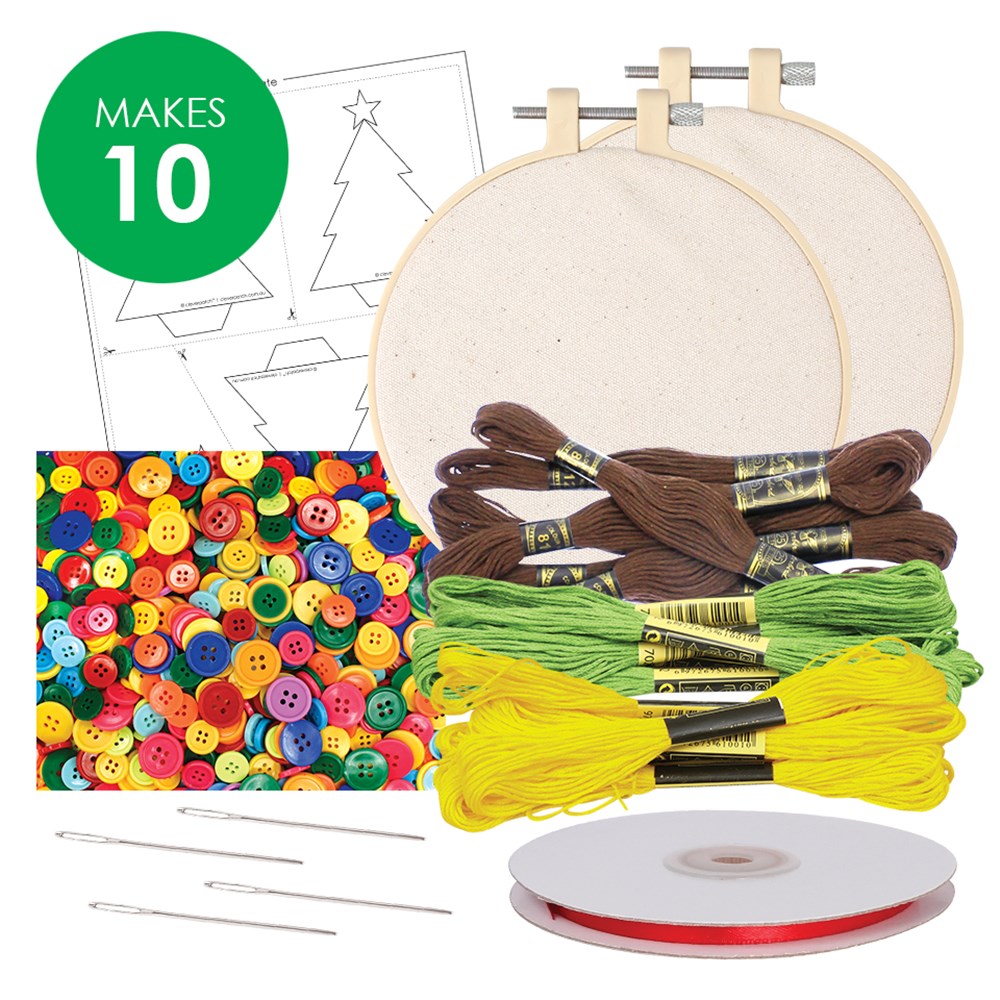 Group pack includes all components required to create 10 Christmas Embroidery Frames. Measures 12cm in diameter (not including hanger) when completed. Scissors are required to complete this activity (sold separately). Contents may vary.