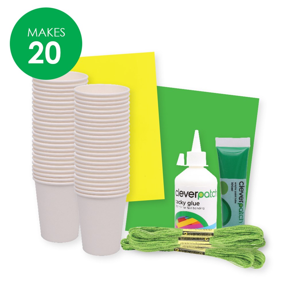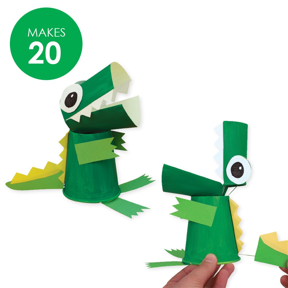Group pack includes all components required to create 20 Paper Cup Crocodiles. Once assembled, simply pull and release your crocodile's tail to open and close its mouth.