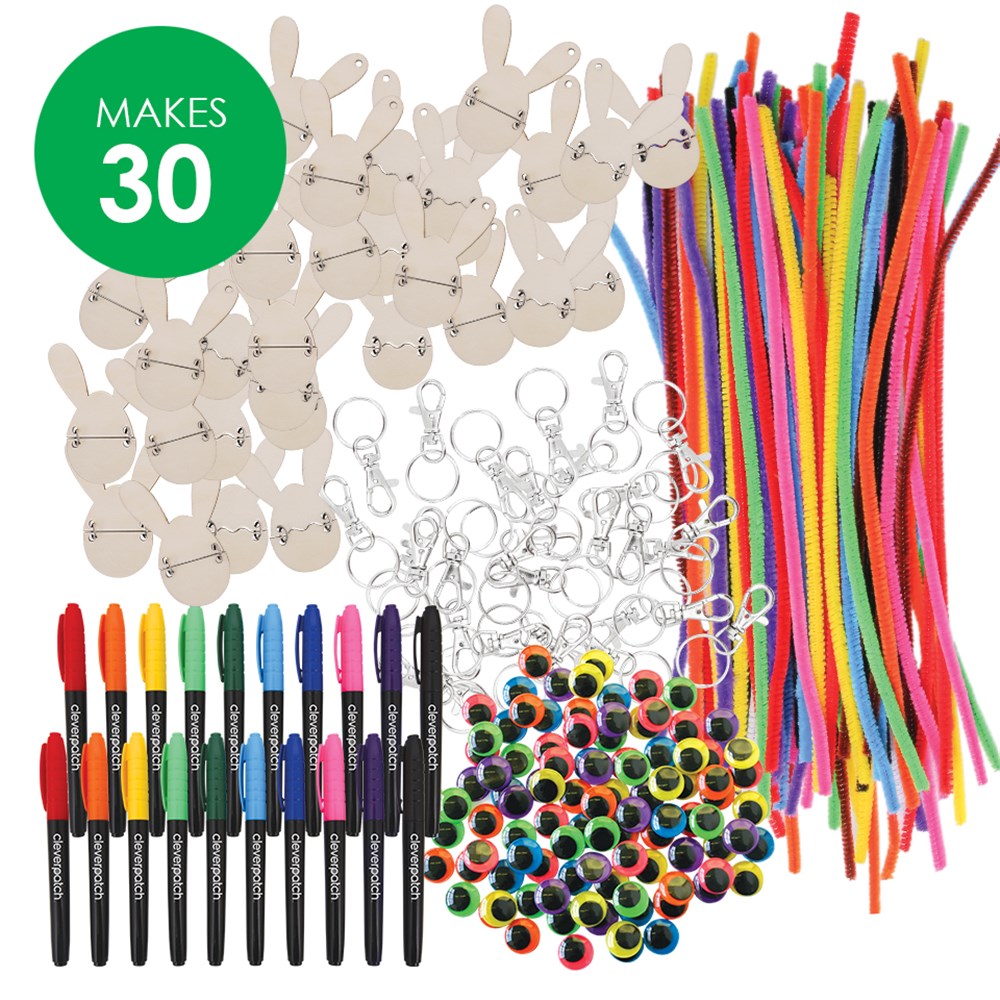 Group pack includes all components required to create 30 Monster Keyrings. Wooden shapes measure 6.2 x 8.6cm. Scissors and glue are required to complete this activity (sold separately). Contents may vary.