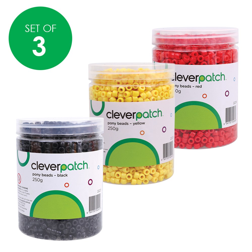 This set of 3 Indigenous colours includes 250g of each colour. Approximately 2,000 beads per tub. Each bead measures 0.6cm in diameter.