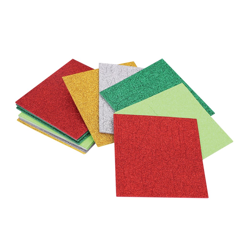 Self-adhesive glitter foam stickers in assorted sizes, colours and Christmas designs.