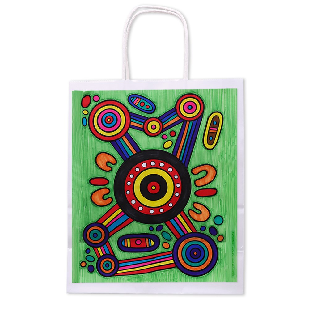 Plain paper gift bags with printed templates designed by Indigenous Artist Belle Leonard symbolising Family and Community.