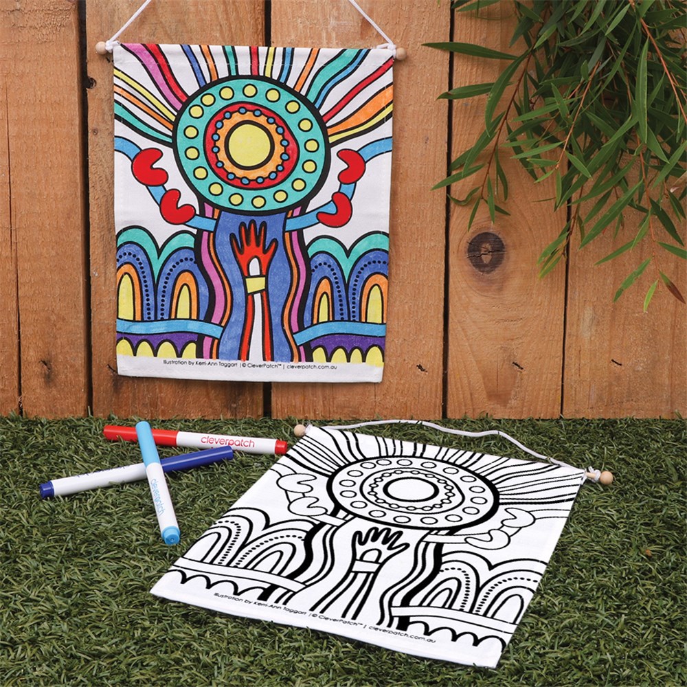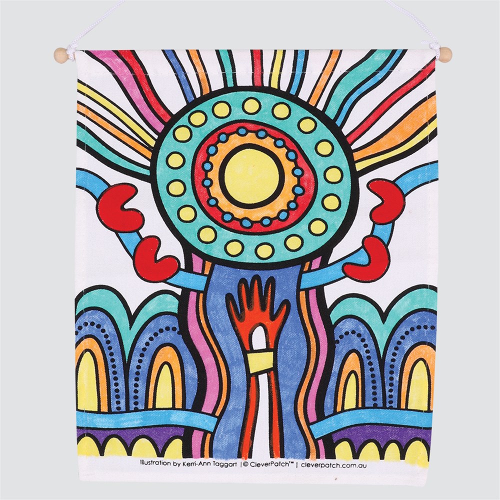 Cotton fabric with black print supplied plain for you to create. Decorate with our CleverPatch Fabric Markers (sold separately) or Fabric Paint. Banner measures approximately 21.5 x 26.5cm (not including hanger).