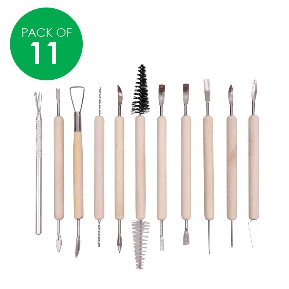 11 assorted modelling tools with wooden handles and metal tips - ideal for use with clay and ceramic. Suitable for cutting, sculpting, carving, smoothing and detailing. Largest tool measures 19.5cm long. Smallest tool measures 13.5cm long.
