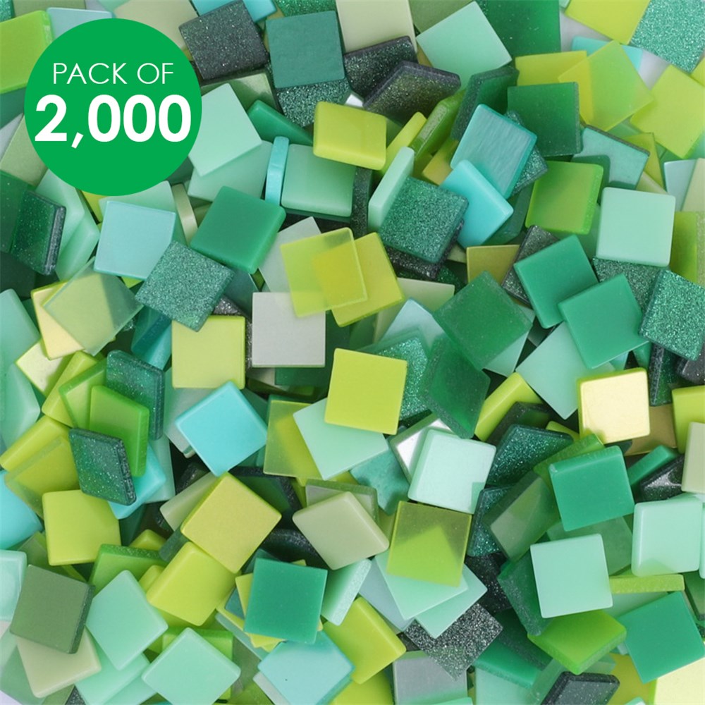 Small resin mosaic tiles in assorted bright colours, and includes various shades of green and turquoise. Lightweight.