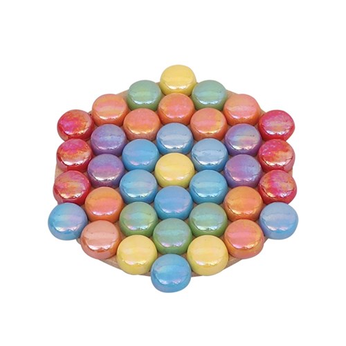 Flat bottomed, round glass tiles in assorted shiny bright colours.