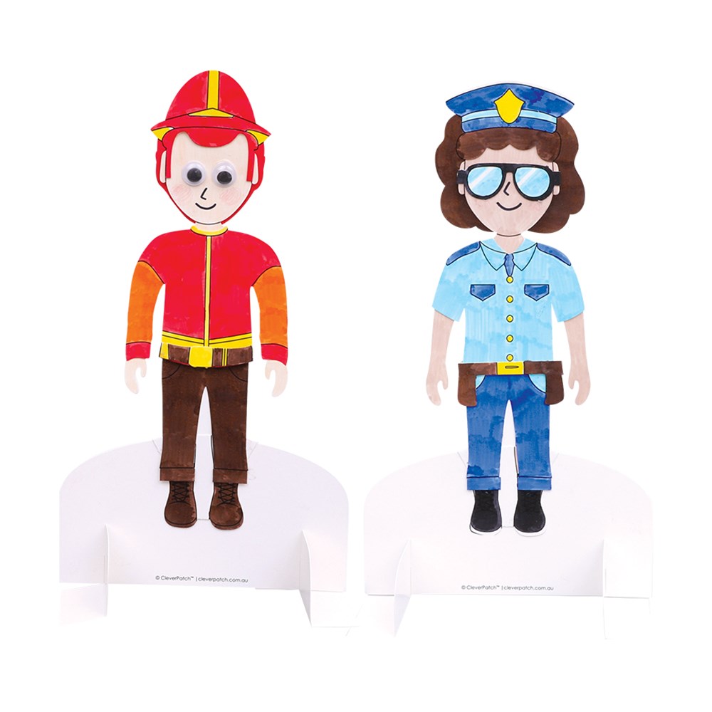 Includes 10 3D people, each with 4 assorted pre-printed and pre-cut outfit designs. Pop out the clothing pieces and dress the cardboard person in the different Community Hero outfits.
