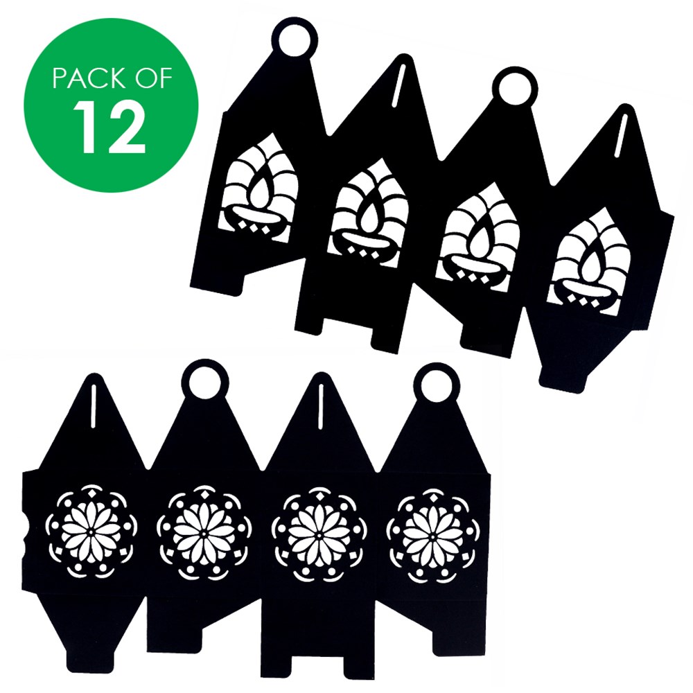 Each pack includes 12 lanterns in 2 assorted designs. Lanterns are supplied plain for you to decorate and flat-packed for easy self-assembly. Includes a hole for hanging