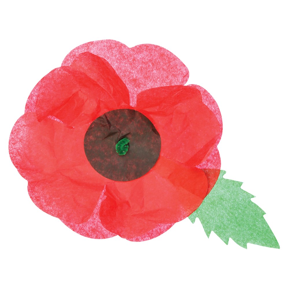 Pack includes tissue paper shapes and chenille stems that will make 50 poppies. Each poppy measures approximately 14cm in diameter when assembled.