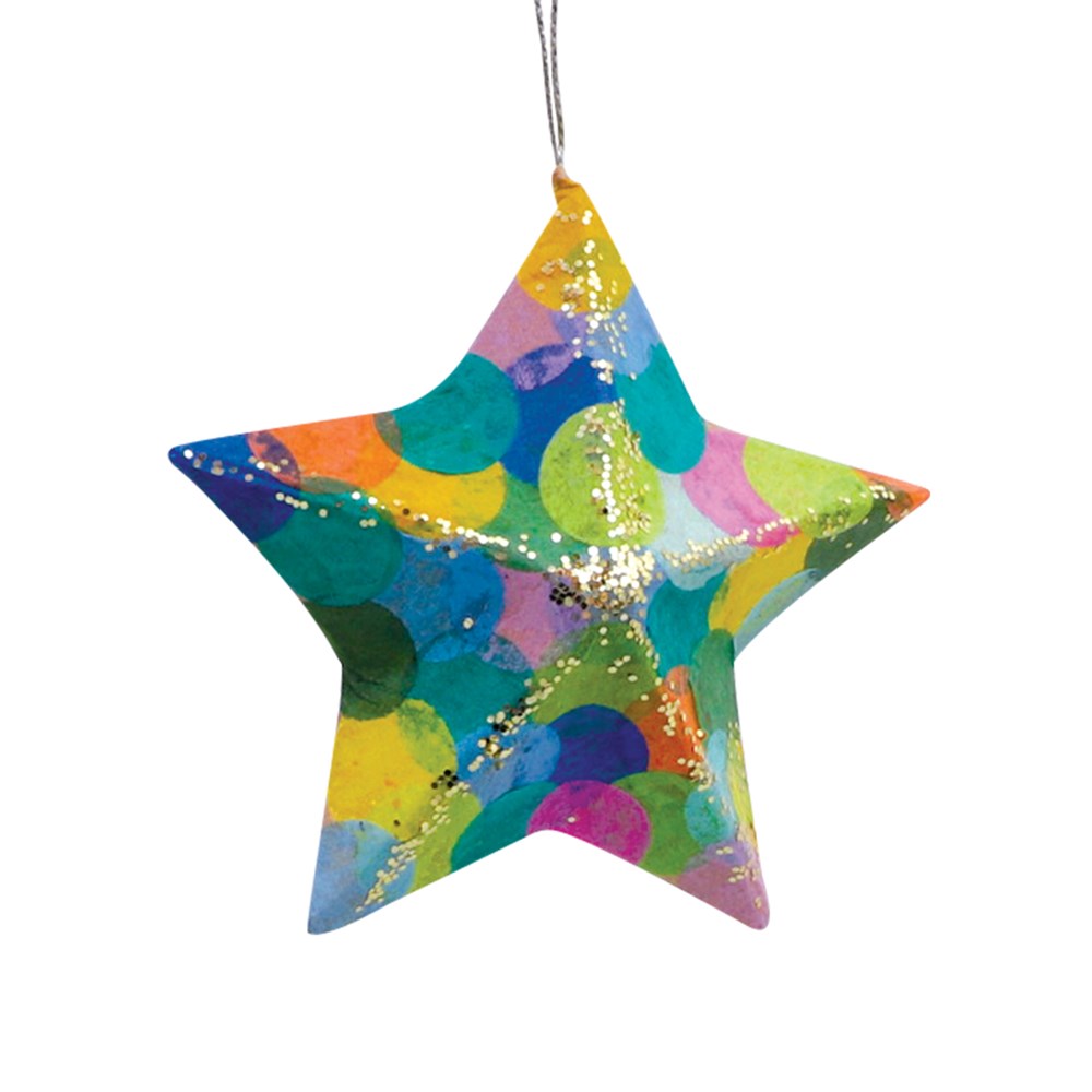 Handmade papier mache star ornament. Includes a string for hanging. Measures approximately 9 x 1.5 x 8.5cm (not including hanger).