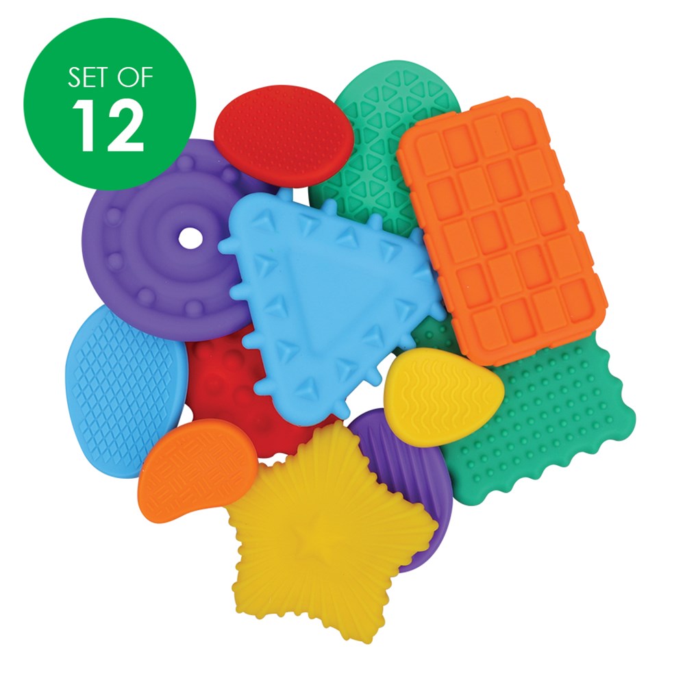 Flexible shapes in assorted colours and sizes. Double-sided textures on most shapes. Largest measures 5.3 x 1.1 x 8.7cm. Storage tub included.