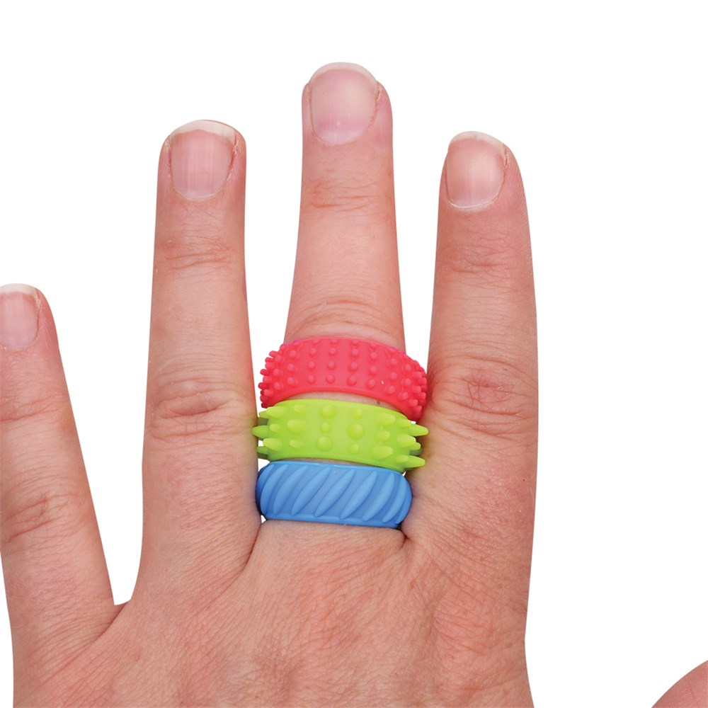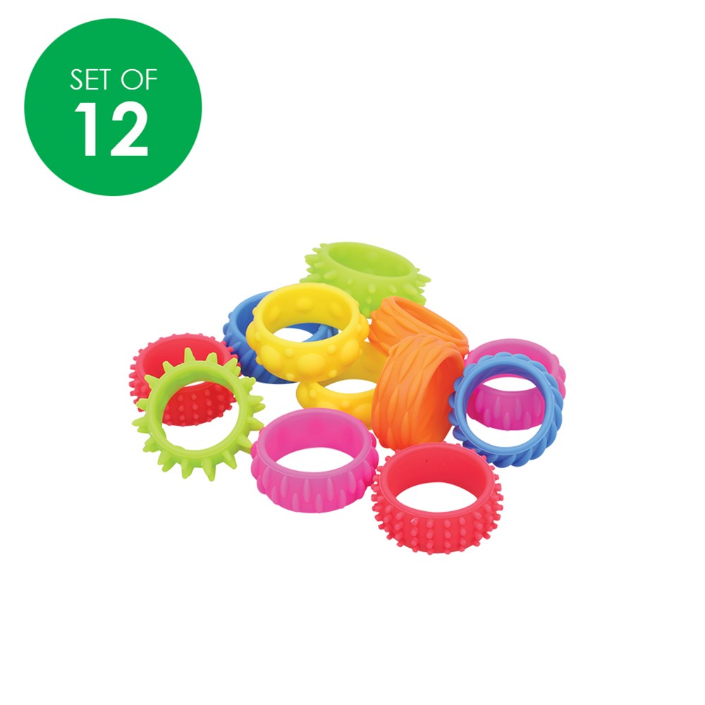 Ideal for sensory engagement and fine motor skills. Assorted bright colours and textures. 2 different sizes. Largest ring measures approximately 2.3cm in diameter.