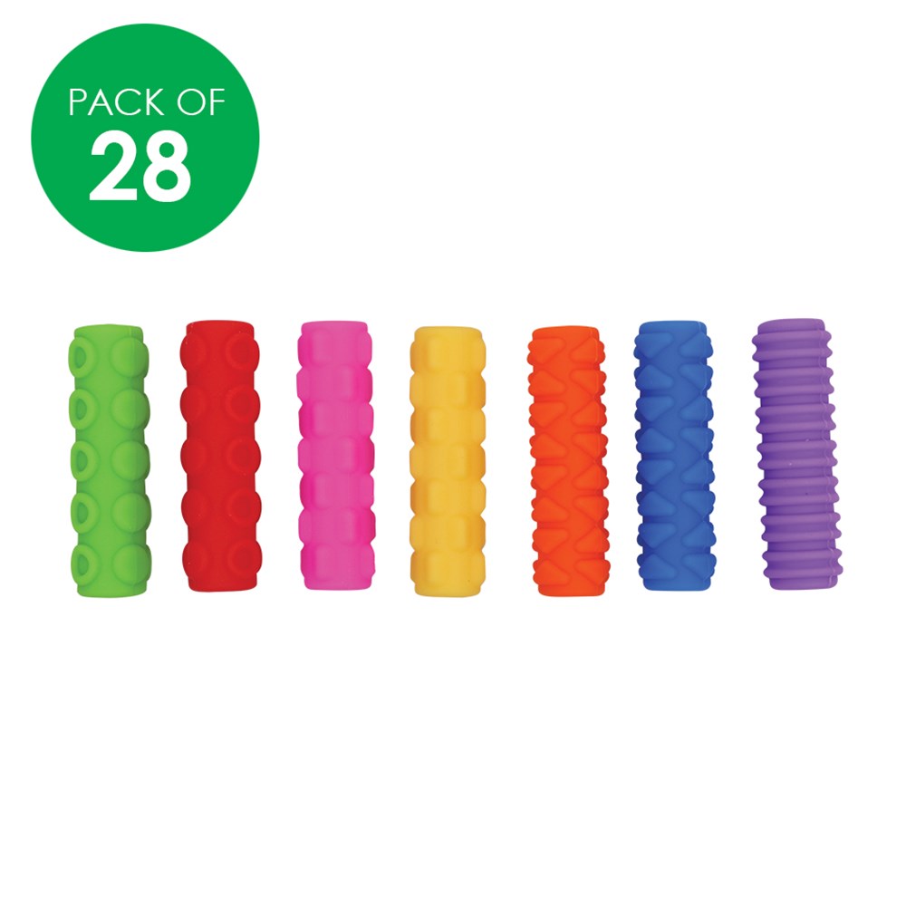 Ideal for encouraging sensory engagement and fine motor skills. Assorted colours and textures. Measures 3.8 x 0.9cm. Ideal for use with most pens, pencils and paint brushes up to 6mm in diameter.