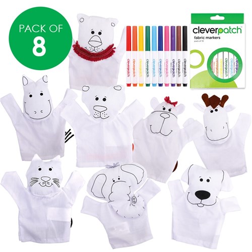 Decorate your own cotton animal hand puppets! Includes 8 assorted pre-printed designs with felt and yarn features. Plain for you to create. Bring your puppets to life using the included Fabric Markers!