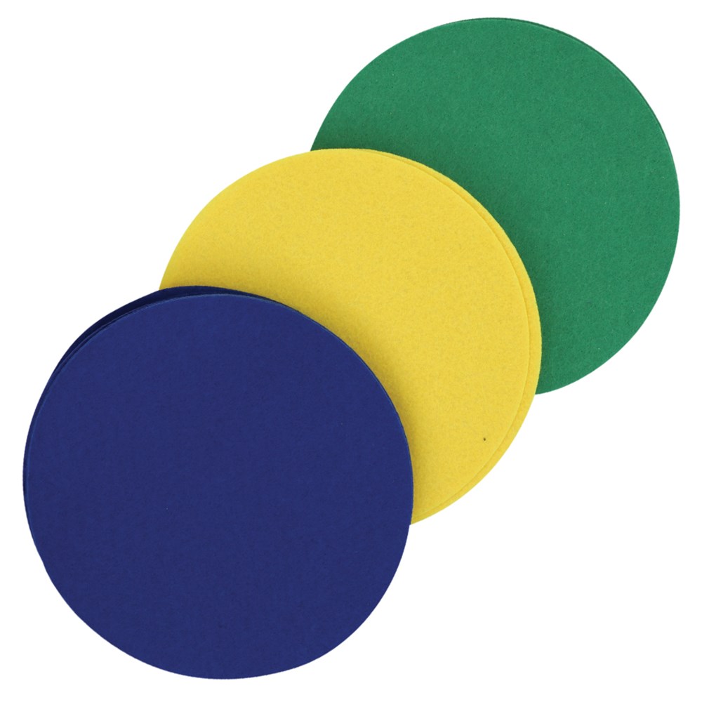 Pack of 36 includes 12 felt circles of each colour (blue, yellow and green). Each circle measures 20cm in diameter.